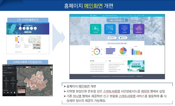 서울시는 ‘서울스마트 불편신고 앱’의 기존 6단계 신고절차를 대폭 간소화, 기능을 개선한 서비스를 오늘(11.17.) 10시부터 개시한다고 밝혔다.