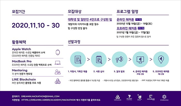 대회 주제는 블록체인 기반 분산형 어플리케이션 디앱(dApp) 개발이다. 대학생 및 일반인 4인으로 구성된 팀 단위로 지원이 가능하며, 개발자와 디자이너가 포함되어야 한다. 참가를 원하는 팀은 11월 30일까지 드림인 홈페이지(https://dreamin.career)에서 프로토타입을 포함한 비즈니스 제안서를 제출하면 된다. 블록체인의 이해, 문제해결 능력, 팀 구성, 비즈니스 가능성 등을 기준으로 심사위원들의 평가를 통해 20개팀을 선발한다.