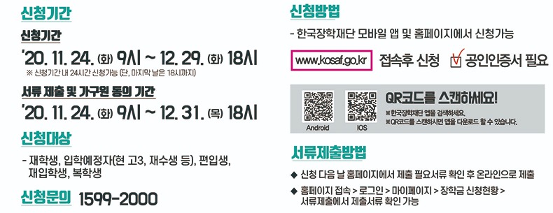 희망자는 재단 누리집(http://www.kosaf.go.kr)과 모바일 응용프로그램을 활용해 24시간 신청가능한데, 신청 마감일인 12월 29일은 18시까지만 신청할 수 있다.