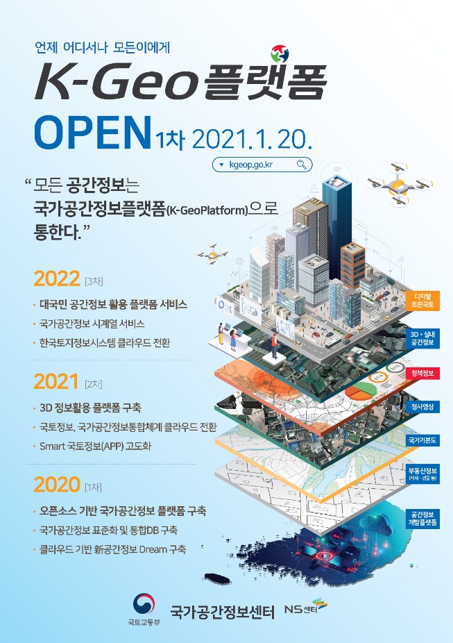 이번 사업을 통해 구축된 클라우드 기반 국가공간정보 통합 플랫폼(K-GeoPlatform)은 표준화된 국가공간정보 공급 및 서비스 활용 환경을 제공하는 것으로서,