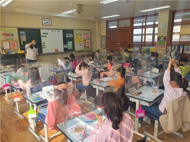 # 지난 11일 경기도 포천의 태봉초등학교 2학년 교실에는 20명의 학생들이 수업에 열중하고 있었으며, 3월 개학과 함께 새로 설치한 공기정화장치가 쉼없이 가동되고 있었다.